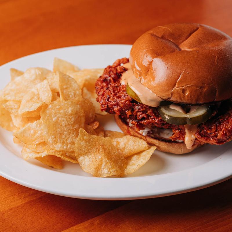 Nashville hot chicken breast fried to perfection, cabbage slaw, homemade comeback sauce, sweet pickles. Served with chips.