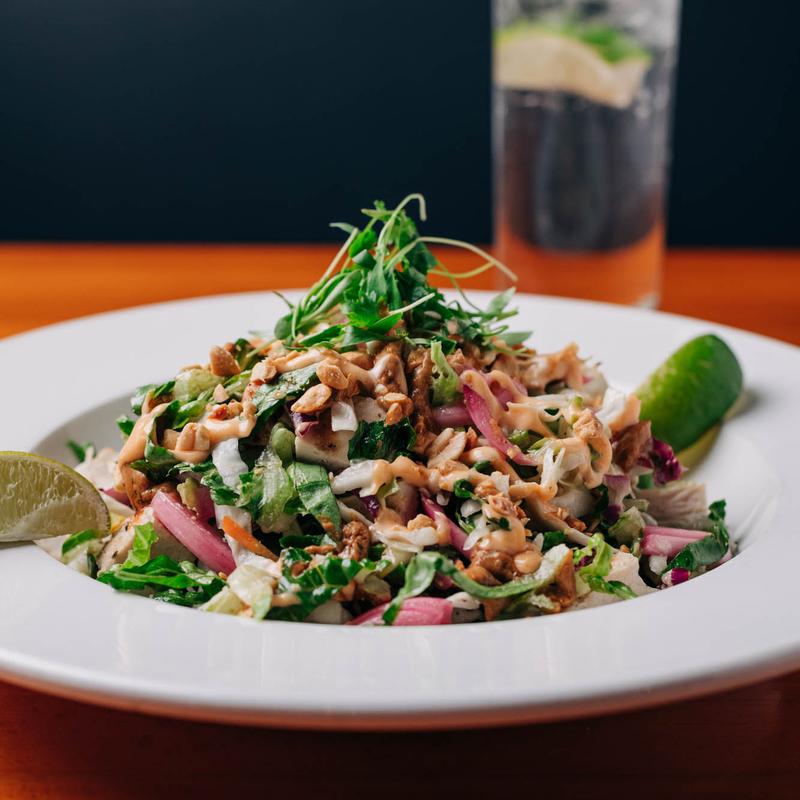 Grilled chicken, pickled red onions, cilantro, carrots, and cabbage, tossed in our citrus vinaigrette, topped with homemade peanut sauce & sriracha aioli.