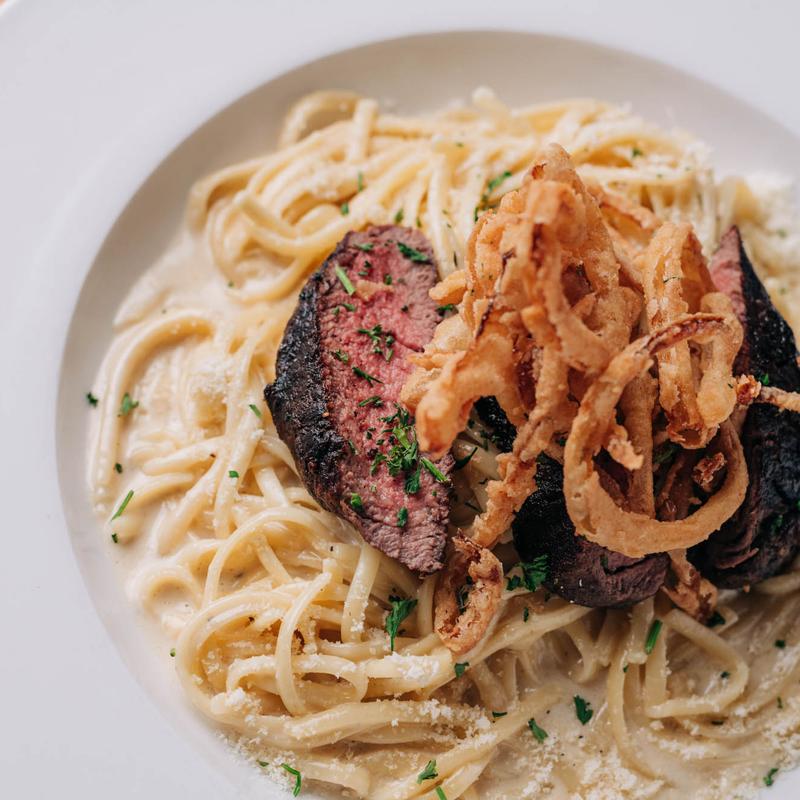 Blackened filet mignon, linguine, garlic cream sauce, crispy onion strings.