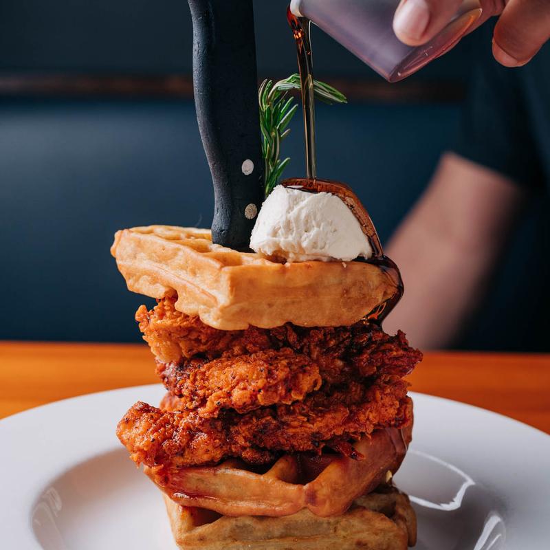 Very Spicy | Nashville hot chicken fingers, cornbread waffles, maple syrup, rosemary, honey butter.