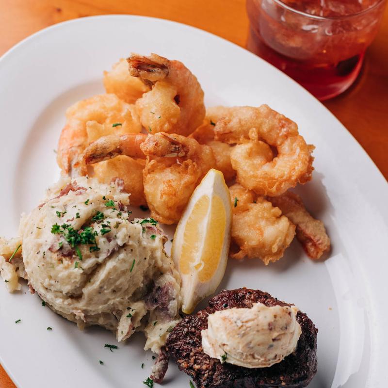 Shrimp tossed with a fiery marinara sauce, linguini, fresh herbs & grilled baguette.