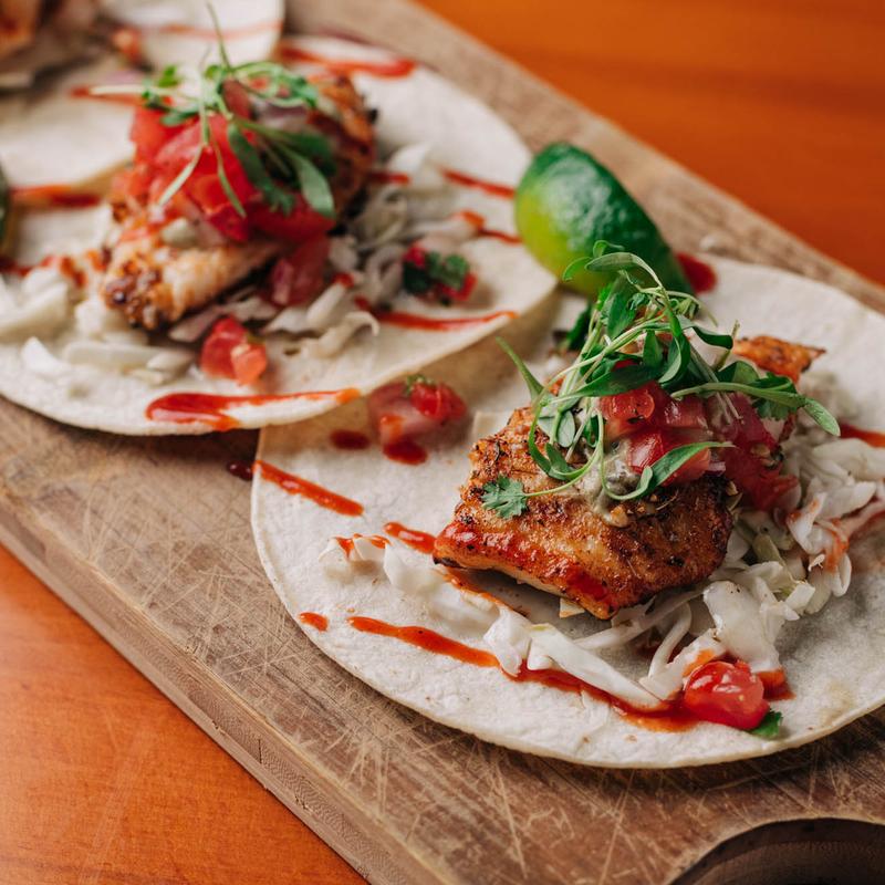 Blackened walleye, fresh cabbage, pico, avocado cream, lemon vinaigrette, hot sauce, and cilantro.