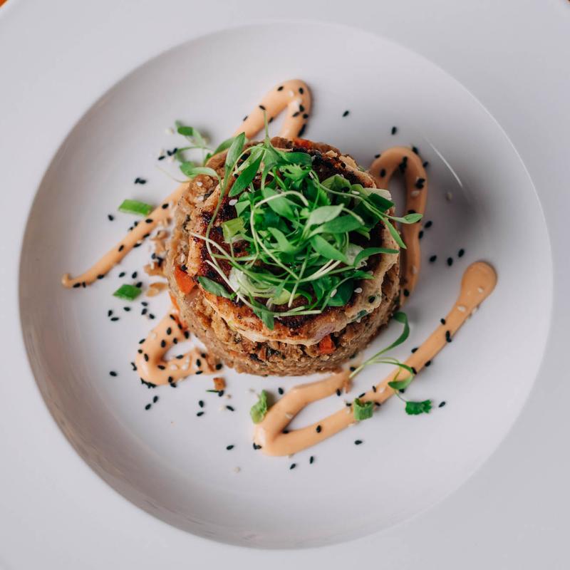 Riced cauliflower, vegetables, eggs, crab cake, sriracha aioli drizzle, garnished with fresh cilantro, green onion, and candied jalapeños.