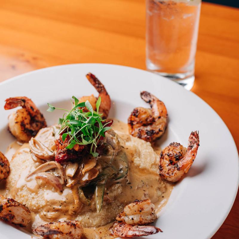 Blackened tail on shrimp, cajun cream sauce, sautéed peppers & onions, cheesy grits, tomato bacon jam, and cilantro.