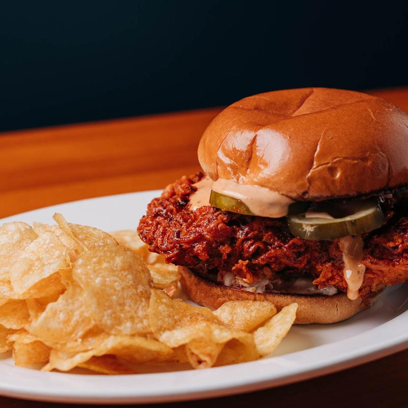 Nashville hot chicken breast fried to perfection, cabbage slaw, homemade comeback sauce, sweet pickles. Served with chips.