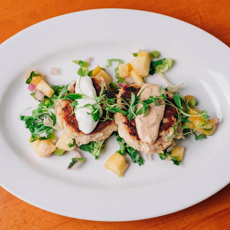 Lump crab, mango salsa, remoulade, and tartar sauce.