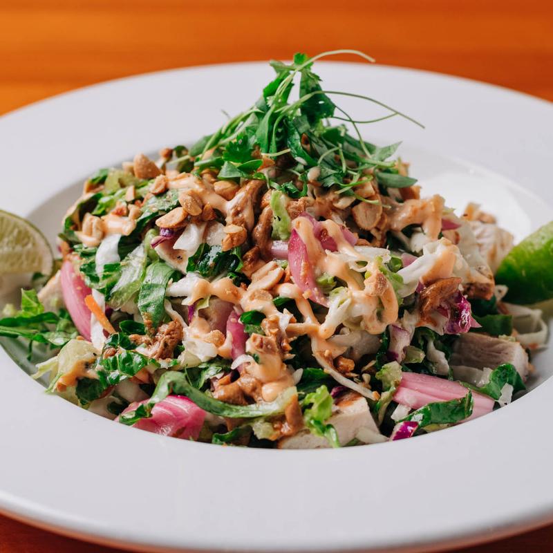 Grilled chicken, pickled red onions, cilantro, carrots, and cabbage, tossed in our citrus vinaigrette, topped with homemade peanut sauce & sriracha aioli.