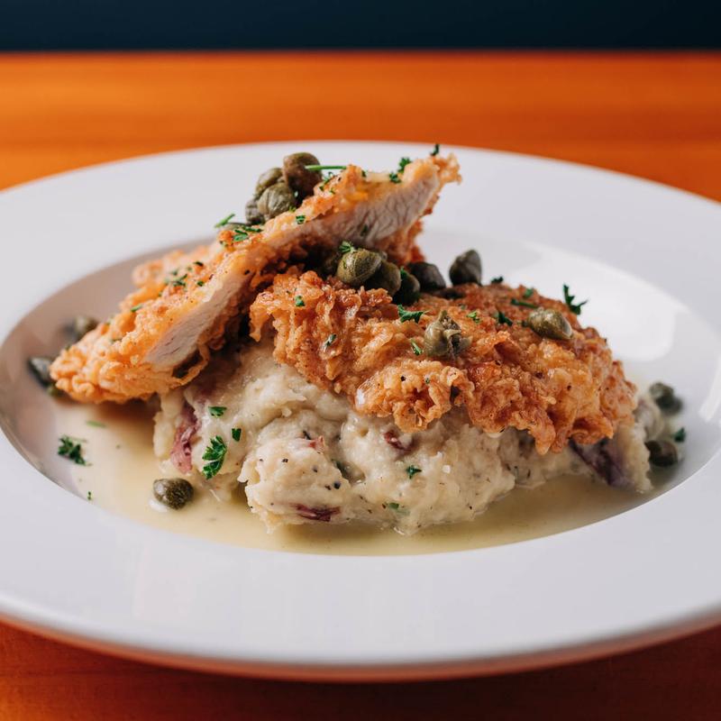 Garlic toast topped with a seared mashed potato cake, house-made meatloaf, crispy fried onions, and drizzled with BBQ sauce.