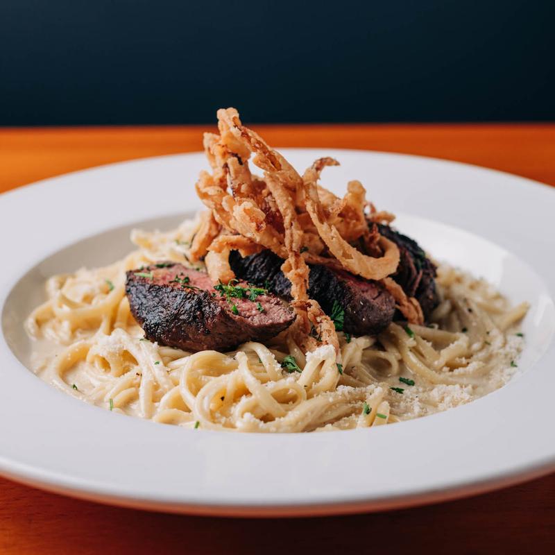 Blackened filet mignon, linguine, garlic cream sauce, crispy onion strings.