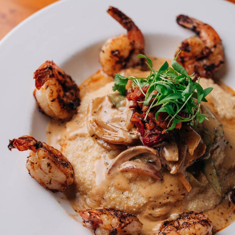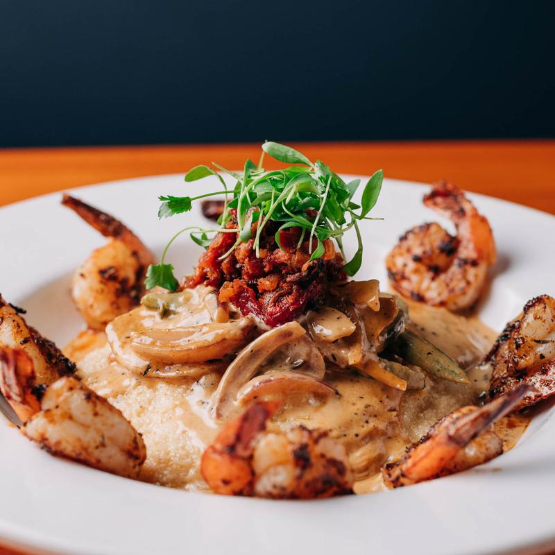 Blackened tail on shrimp, cajun cream sauce, sautéed peppers & onions, cheesy grits, tomato bacon jam, and cilantro.