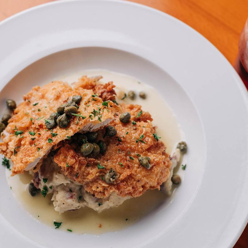 Garlic toast topped with a seared mashed potato cake, house-made meatloaf, crispy fried onions and drizzled with BBQ sauce.