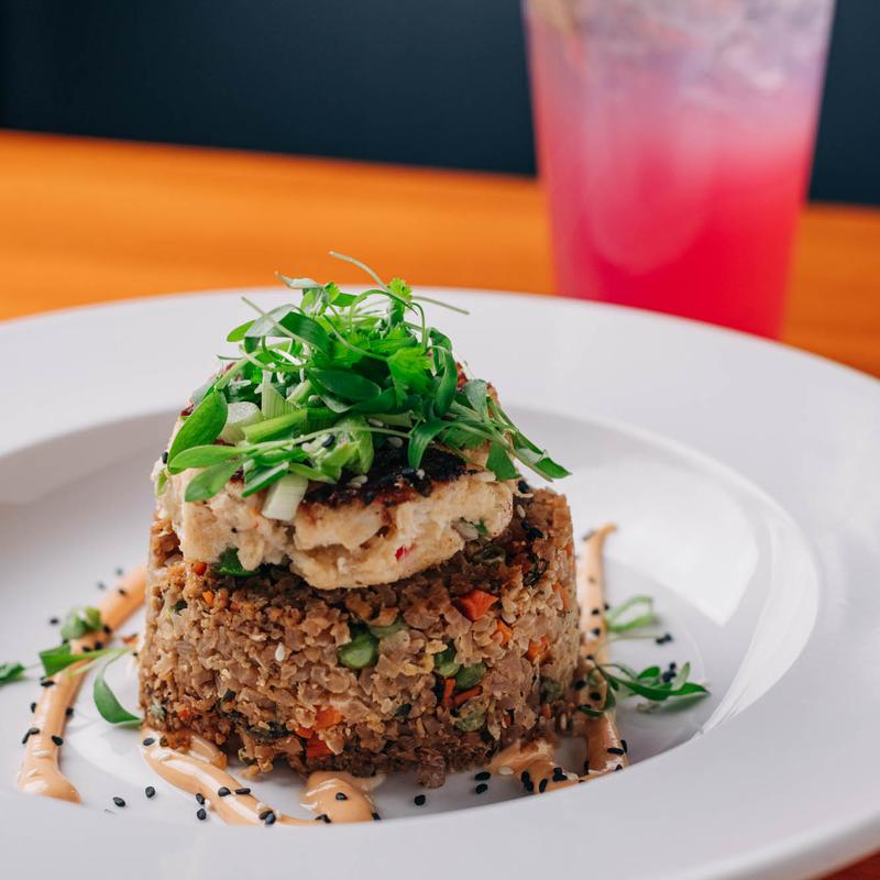 Riced cauliflower, vegetables, eggs, crab cake, sriracha aioli drizzle, garnished with fresh cilantro, green onion, and candied jalapeños.