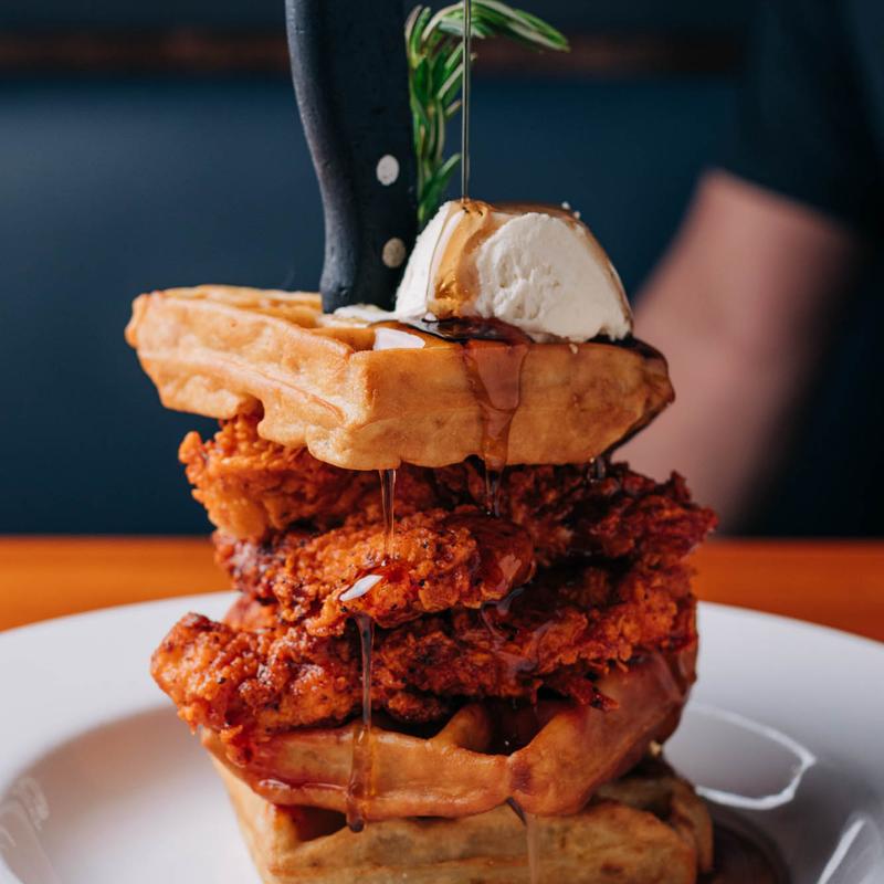 Very Spicy | Nashville hot chicken fingers, cornbread waffles, maple syrup, rosemary, honey butter.